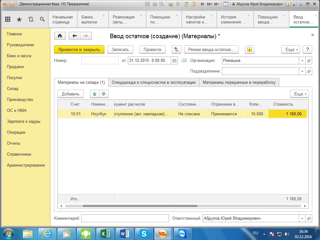 Вам придется сделать Ввод начальных остатков на 31.12.15 и указать статус расходов по каждой номенклатуре.