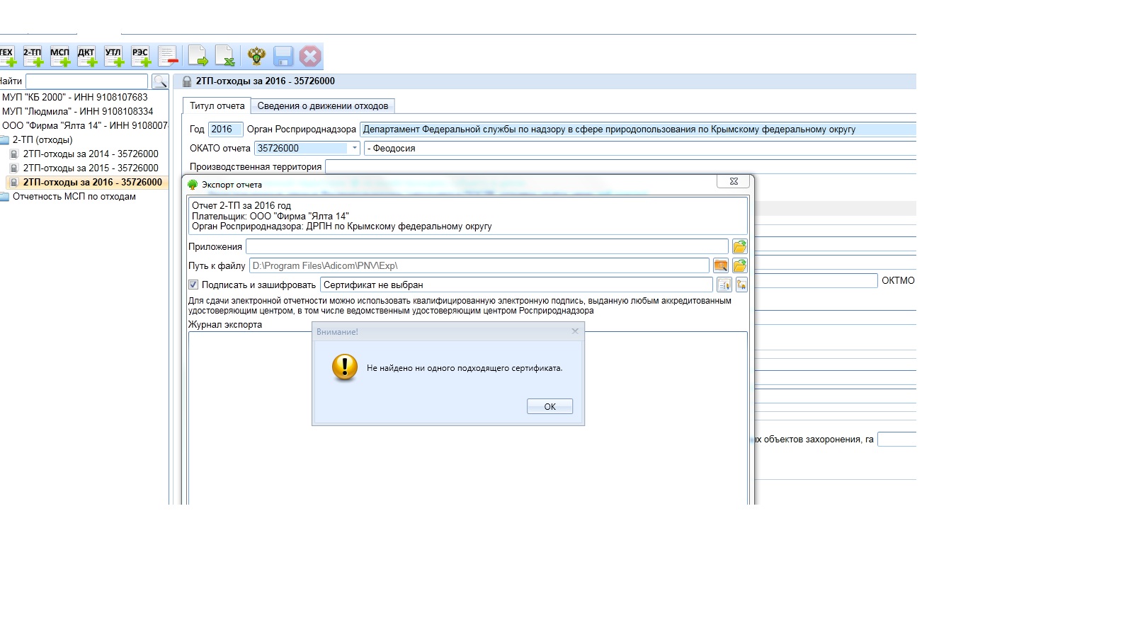 Но когда захожу в "Выгрузить отчет для передачи" и нажимаю кнопочку "Выбрать сертификат" программа его не находит