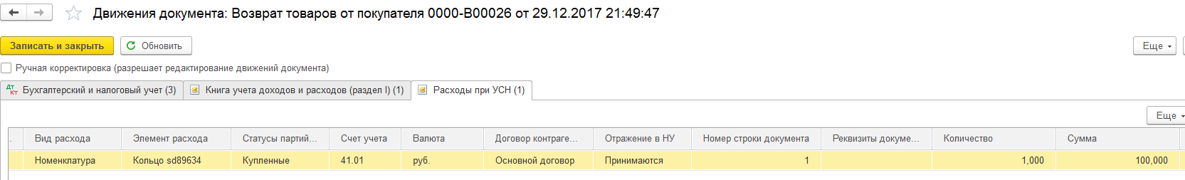 т.е. при проведении документа в Бухгалтерии 3.0 "Возврат от покупателя" в расходы КУДиР попало всего 100 руб. и таких документов несколько в 2015 и 2017 году.