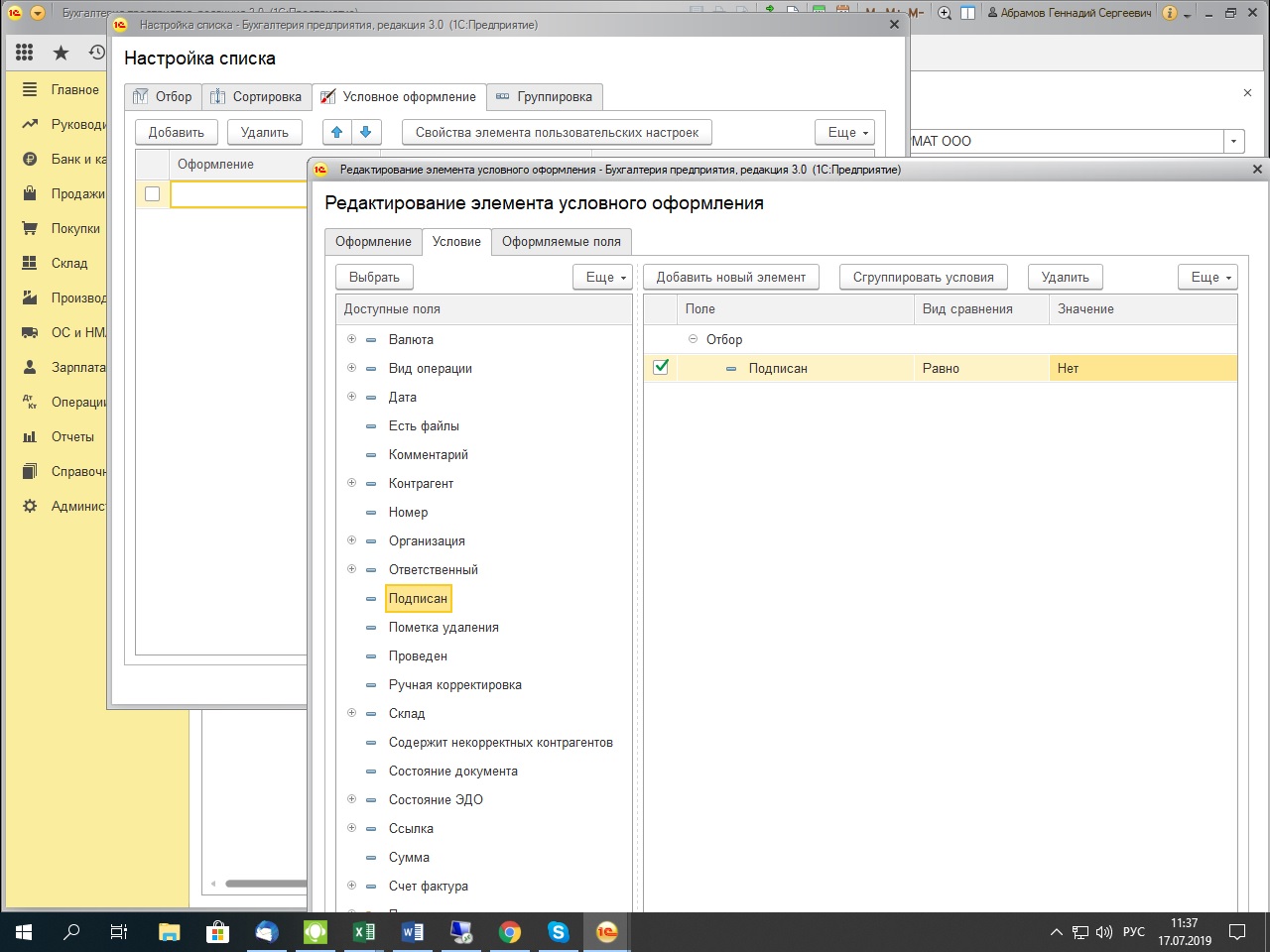 Хочу задать условие, чтобы выделять накладную, если в ней стоит галочка, что Документ подписан.