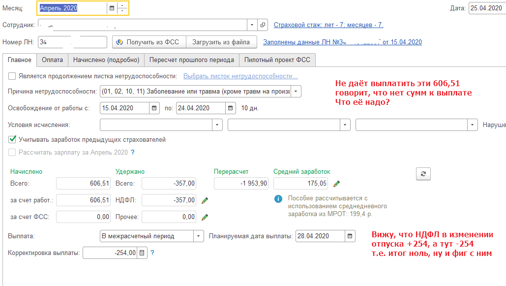 Теперь больничный. Посчитано выходит верно.