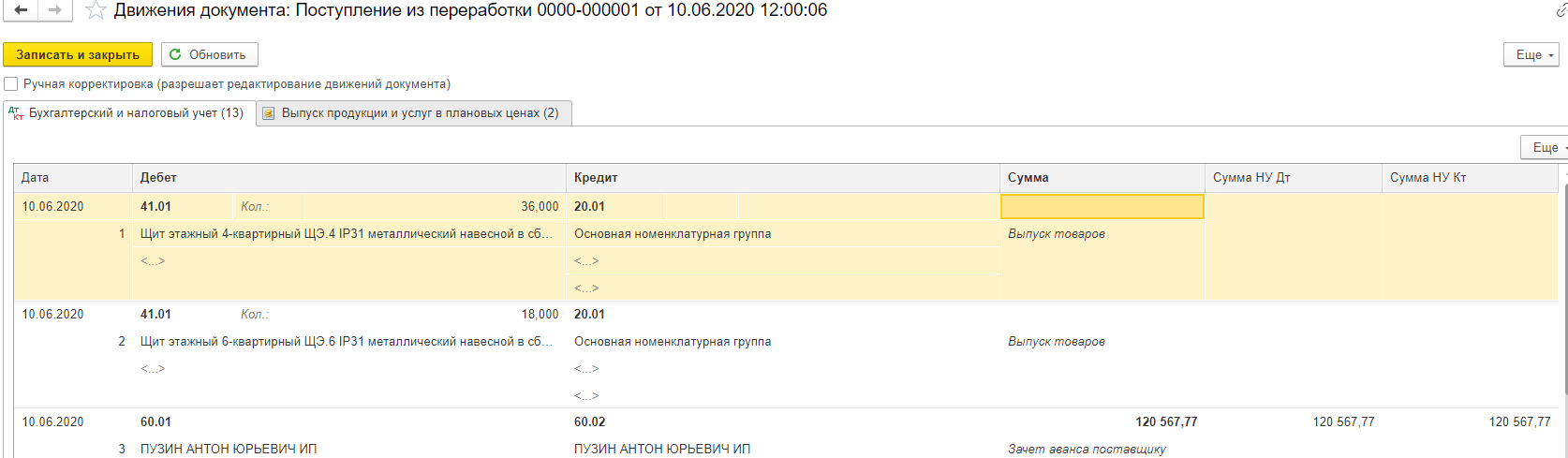 ООО на НДС. Напишу все по порядку. ООО закупило товар Щит этажный ЩЭ 6 кв. навесной (945х880х220) IP31 EKF PROxima у поставщика поставила на 41 счет.Но покупателю необходимо продать этот Щит в сборе, соответственно ООО пользуясь услугами ИП передает эму товары. Делаю я через операцию Передача сырья в переработку. Следующая операция когда готов Щит в сборе дела. Поступление из переработки. И далее уже реализация. Но сейчас почему то когда месяц закрываю выдает такой минус.прилагаю скрины с 1С8.3. Да и с Щит этажный 5-квартирный ЩЭ.5 IP31 металлический навесной в сборе там наоборот не в минусе а в плюсе. Регламентная операция закрыла так. Если я отменяю проведение месяца все нормально встает. 1С:Предприятие 8.3 (8.3.15.1999) Бухгалтерия предприятия, редакция 3.0 (3.0.79.11) () |