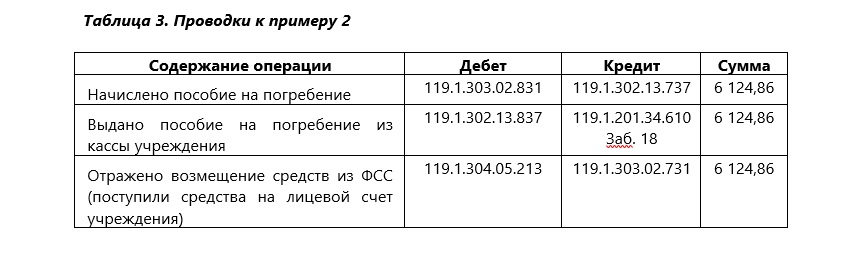 В 2020 году в рамках предупредительных мер казенное учреждение оплатило расходы на обучение своих сотрудников. Стоимость обучения составила 50 000 руб. В этом же году учреждению были возмещены средства из ФСС в сумме 7 000 руб. в счет произведенных в 2019 г. расходов на оплату предупредительных мер. Данные средства были перечислены территориальным отделением фонда напрямую в доход бюджета. Казенное учреждение является участником пилотного проекта ФСС и наделено отдельными полномочиями по начислению и учету платежей в бюджет. В соответствии с Инструкцией № 162н в бюджетном учете учреждения будут сделаны следующие проводки, указанные в таблице 2. После внесения поправок в Порядок №209н и Инструкцию №162н данные операции будут отражаться в учете с применением подстатьи 139 КОСГУ и счета 1 209 39 000. В адрес администратора кассовых поступлений казенное учреждение направляет извещение (ф. 0504805) в двух экземплярах с информацией об ожидаемом поступлении доходов бюджета. Расходы, связанные с выплатой пособия на погребение и оплатой дополнительных выходных дней, предоставляемых для ухода за детьми-инвалидами, следует относить: • на КВР 119 «Взносы по обязательному социальному страхованию на выплаты по оплате труда работников и иные выплаты работникам учреждений», 129 «Взносы по обязательному социальному страхованию на выплаты денежного содержания и иные выплаты работникам государственных (муниципальных) органов», 149 «Взносы по обязательному социальному страхованию на выплаты по оплате труда работников и иные выплаты работникам государственных внебюджетных фондов»; • на подстатью 213 «Начисления на выплаты по оплате труда» КОСГУ. Возмещение ФСС в текущем финансовом году указанных расходов, произведенных в том же финансовом году, следует учитывать, как восстановление кассовой выплаты и отражать по тем же КБК, по которым она была произведена. Это предусмотрено п. 2.5.4 Порядка № 8н. Пример 2. В феврале 2020 г. казенное учреждение (участник пилотного проекта ФСС) выдало из кассы пособие на погребение сыну умершего работника в размере 6 124,86 руб. В марте территориальный орган ФСС возместил учреждению соответствующие расходы в полной сумме. Деньги были перечислены на лицевой счет учреждения и отражены как восстановление кассового расхода. Данные операции отразятся в бюджетном учете следующими проводками, указанными в таблице 3. В рамках пилотного проекта выплата социальных пособий работникам осуществляется через территориальные органы ФСС, а не через работодателя. Наряду с этим расходы на предупредительные меры, выплату пособия на погребение и оплату дополнительных выходных дней для ухода за детьми-инвалидами работодатель осуществляет за счет собственных средств с их последующим возмещением из бюджета ФСС. Приобретение товаров, работ и услуг в целях предупредительных мер страхователь отражает по КВР 244 в увязке со статьями (соответствующими подстатьями) 220, 267, 310, 340 КОСГУ. Поступление от ФСС возмещения указанных расходов следует признавать по соответствующим подстатьям и элементам доходов кода вида доходов бюджетов 000 1 13 02990 00 0000 130, увязанного с подстатьей 134 КОСГУ. Предполагается, что после внесения поправок в Порядок № 209н данные поступления будут учитываться по новой подстатье 139 КОСГУ. Расходы, связанные с выплатой пособия на погребение и 