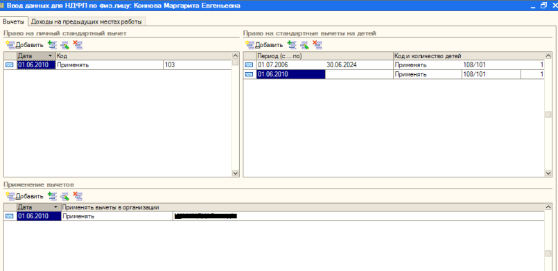 Внесли ее доходы по справке с прошлой работы. Заполнили - применять вычеты станд+на детей. Стали начислять з/п - стандартный вычет не предоставил, только на детей. Причем ситуация повторилась и в июне, и в июле. |