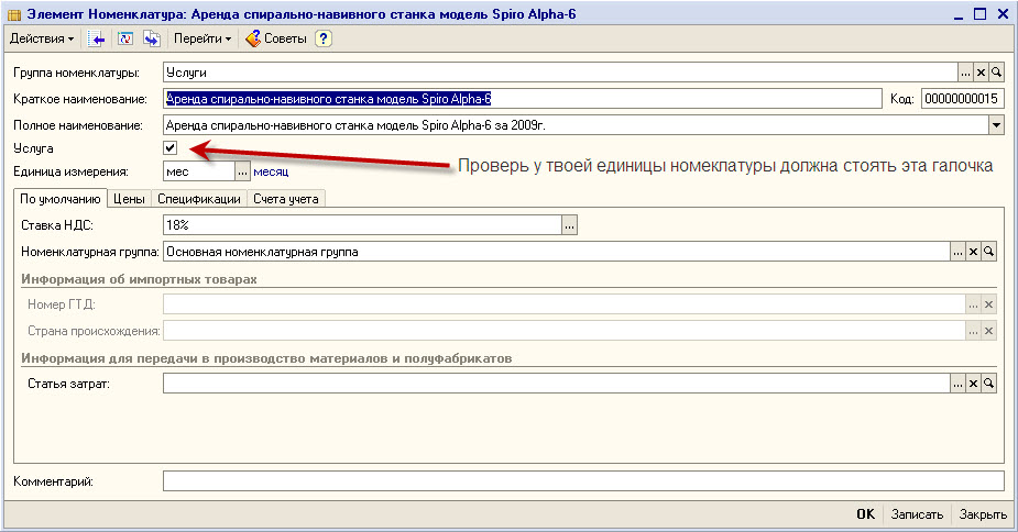 никак не могу провети акт об оказании услуг - программа пишет, что операция не выполнена, тк "В строке номер "2" табличной части "Услуги": содержится номенклатура, не являющаяся услугой. Здесь могут быть только услуги!" - проверяю, все нормально, услуга взята откуда надо. что делать?