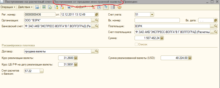 так я же выложила скрин поступления на ВАЛЮТНЫЙ счет, а не на рублевый, Дт 52! А на рублевый у меня такой же документ, как в Вашем скрине