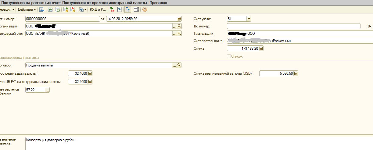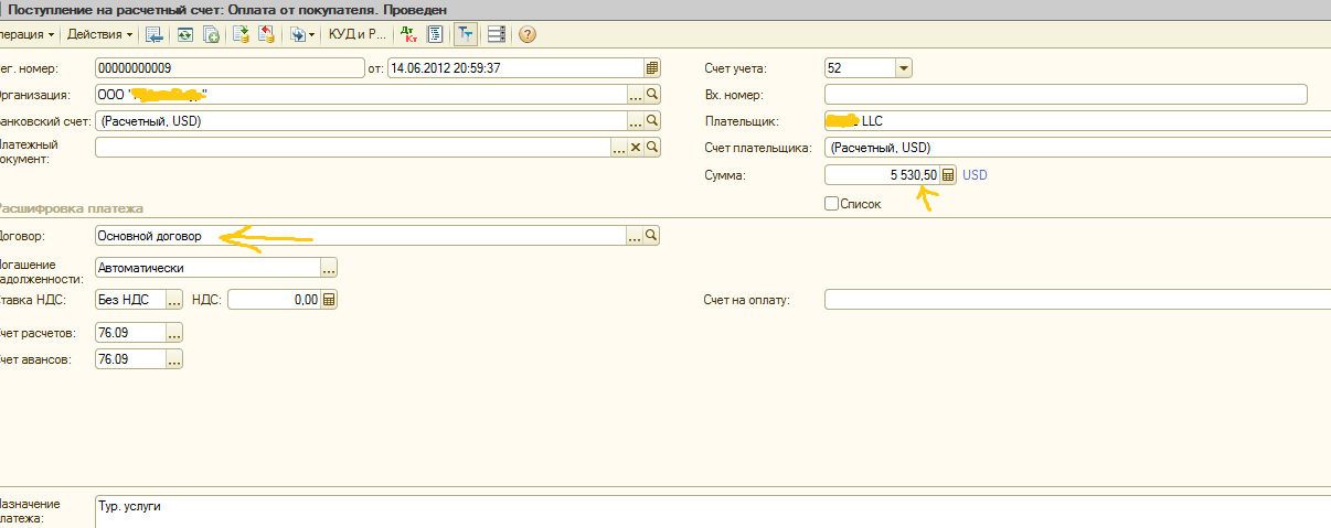 в скрине № 1 "основной договор" стоит в долларах, сумма стоит тоже доллары, и в проводках тоже стоит долларовая сумма. Это правильно? в скрине № 2 "получатель" и "контрагент" (он же) выбран из справочника, хотя получатель -наша организация. Но выбираю я её из справочника, правильно же? иначе никак не выбрать нашу организацию в графе получатель? скрин № 3: именно по этому документу в оборотке сминусована сумма долларов из рублевого эквивалента.