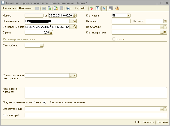 Документ: Списание с расчетного счета. прочее списание.