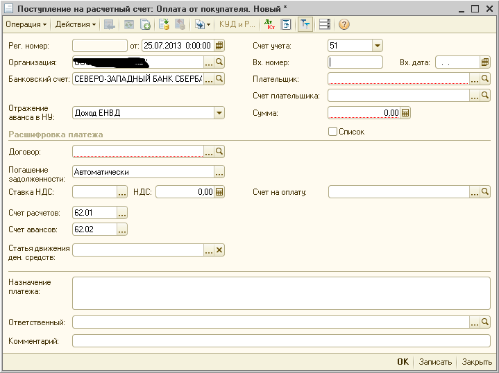 Документ: Поступление на р/сч. Прочие расчеты с контрагентами.