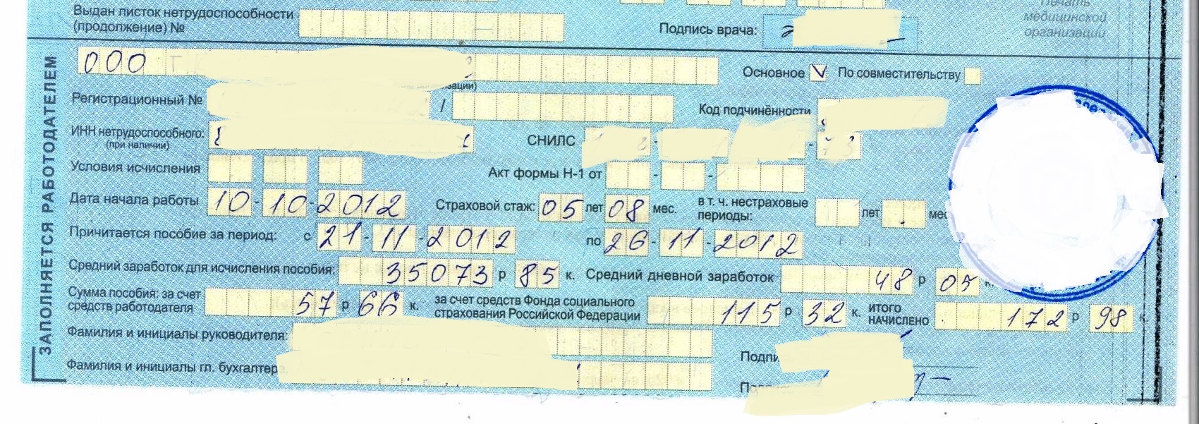 Добрый день. Решила проверить больничные листы которые были заполнены до меня. В итоге обнаружила ошибку. Сотрудница устроилась на работу в октябре 2012 года, до работала в другой организации и была в отпуске по уходу за ребенком, уволилась с прежнего места работы в сентябре 2012г. В ноябре 2012 года идет на больничный, с прежнего места работы у нее справки нет, только 2-НДФЛ за 2010 год 35073,85 р. И больничный посчитан именно из этого заработка. Как быть в этой ситуации? Правильно посчитать пособие, в данном случае, исходя из МРОТ за 2010 и 2011 год. Там еще Страховой стаж неправильно посчитан. Корешок заполнен не черной гелевой ручкой, а синей шариковой. Скан корешка б/л который заполняет организация прикрепляю.