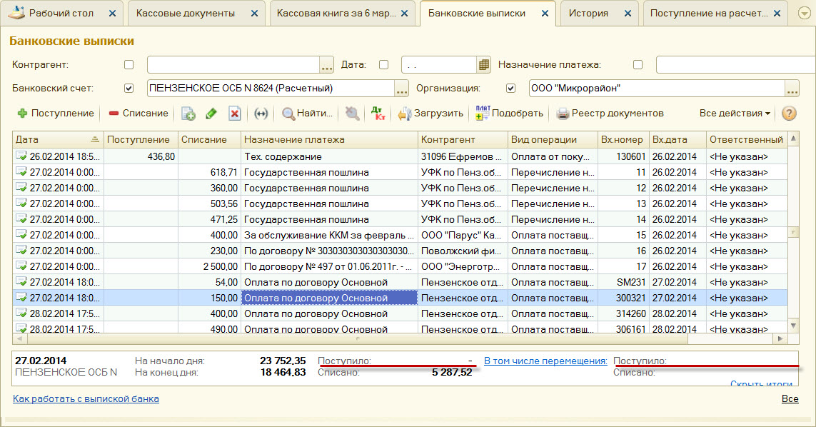 теперь я понял, в чем ваша проблема. У вас не в учете, а в самой выписке не появлялась соответствующая строка.