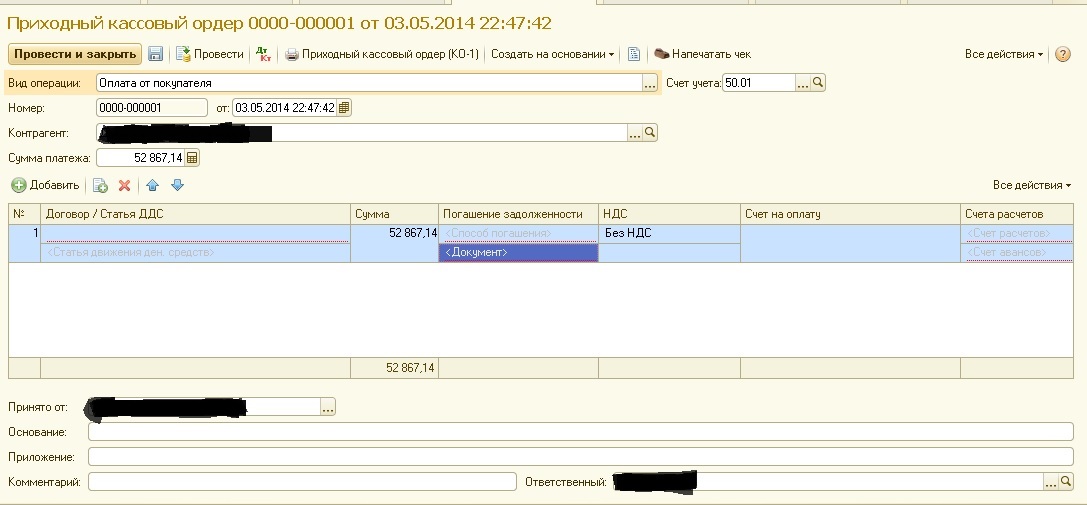 Вы создаете ПКО оплата от покупателя ? или вы вносите денежные средства для того, чтобы в дальнейшем произвести оплату поставщику ? У нас речь вроде бы шла о том, что вы вносите деньги в кассу, а в дальнейшем производите оплату поставщику, так ? Если так, то : 1. Вид операции - это не оплата покупателя, в взнос предпринимателя, поэтому нужно выбрать Прочий приход. 2. Счет кредита, можно выбрать 76, по субъсчетам посмотрите какой бы подошел для вашей операции, может быть 76.9 3. Статья движения денежных средств - у вас скорей всего такой статьи нет в справочнике, поэтому ее нужно создать самостоятельно добавив в справочник назвав ее "Взнос предпринимателя". 4. Принято : найдите в справочнике физ лиц себя. 5. Основание : взнос предпринимателя. После того как сделаете ПКО, дальше делаете РКО и там уже выбираете Вид операции : Оплату поставщику Получатель : выбираете из справочника своего поставщика. В табличной части: договор(выбираете договор с этим поставщиком, либо просто Основной/ статья движения денежных средств - оплата товаров, работ, услуг. Способ погашения задолженности : по документу/документ (выбираете накладную, которую вы уже должны внести в Поступление товаров и услуг. Счета расчетов : 60.1 и 60.2 А дальше, как это сделать в 1С 8.3, чтобы это не попало в доход, я не подскажу, потому что у меня нет базы 8.3 с ИП на ОСНО, как там заполняется книга доходов и расходов не знаю, может быть кто-то на форуме сможет подсказать.