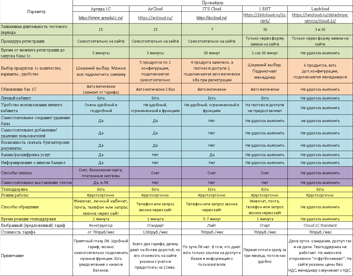 Вариант удобный, тем более что многие из таких компаний, обещали еще и сокращение затрат. Поисковик «Яндекс» по запросу «аренда 1С в облаке» выдал большой список поставщиков и, мне предстояло определиться, кого же из них выбрать. Вот кого рассматривала, в качестве возможных поставщиков и, мнением о которых, хочу поделиться с вами: 1. IT-Lite; 2. Scloud; 3. EFSOL; 4. 1С-Архитектор Бизнеса; 5. 1С Рарус; 6. Аренда 1С; 7. ArCloud; 8. IT'S Cloud; 9. 1 БИТ; 10. Landcloud. При беглом осмотре сайтов и предложений, все казалось примерно одинаковым. Хорошо, что все поставщики предлагают бесплатный ознакомительный доступ и можно попробовать «тест драйв», а не просто поверить рекламе или обещаниям продавца-консультанта. Я решила подойти к вопросу основательно и составить список основных интересующих меня характеристик. Это удобство регистрации и использования, оплаты и наличие линии поддержки (технической и консультационной). Постаралась подробно рассказать о каждом рассмотренном мною поставщике, но если где-то получилось немного – значит, о них совсем нечего сказать. Не отличились ни чем-то хорошим, ни плохим. С полным списком вы можете ознакомиться в таблицах, а пока о каждом поставщике чуть подробнее. 1. IT-Lite. Регистрация довольно сложная – отправляешь заявку на сайте, ждешь пока тебе позвонит менеджер, выяснит интересующие тебя вопросы или ответит на твои и предоставит доступ. У меня от момента регистрации, до входа в 1С ушло почти полтора часа. Личного кабинета не нашла или его нет. По сути, даются различные варианты входа в программу (WEB, RDP, тонкий клиент), а дальше все через менеджера и техподдержку. Кстати, на мой вопрос, заданный через чат на сайте никто не ответил. Попросила мне перезвонить, есть и такая функция на сайте. Перезвонили сразу, но вопрос в итоге решали более часа. 2. Scloud. Процесс регистрации прост и понятен. Заходишь на сайт, оставляешь свои данные. Через пару минут у тебя уже есть доступ и к личному кабинету и новой, пустой базе. К слову сказать, личный кабинет многофункционален. В нем можно самостоятельно добавить или удалить пользователя, базу свою загрузить, счет на оплату услуг заказать. Единственное, что омрачило мое впечатление – это уловка с ценами. На сайте они указаны с учетом предоплаты за год, а без нее разница 200руб/мес. Да и менеджер настойчиво уговаривает подключаться на самый дорогой тариф с «кучей» всяких функций, которые мне, по сути, не были нужны. 3. EFSOL. Уж не знаю политика ли это компании или решение самого менеджера, но предоставить мне доступ могли, только подключившись к моему ноуту. Регистрация у них тоже только через заявку на сайте. После нее звонит менеджер, все очень подробно и понятно рассказывает. Рассказывает так, что уже хочется попробовать, но после того, как он предлагает «залезть» в мой компьютер и все установить, желание пропадает. Другого варианта подключения менеджер, который со мной общался, не предложил. 4. 1С-Архитектор Бизнеса. Здесь процесс регистрации через заявку. Чат на сайте ночью не работает. Оставляла заявку, чтобы мне перезвонили – так и не дождалась звонка. Днем оставила тот же вопрос в чате – примерно через час мне ответили. Менеджеры по продажам работают явно лучше техподдержки. Через 10-15 минут после регистрации мне перезвонил парень и подробно рассказал о сервисе, а вот доступ пришлось ждать более 3 часов. 5. 1С Рарус. Ре