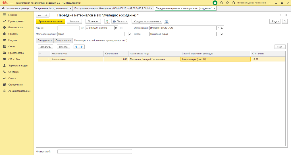 Например, если сотрудник трудится неполный рабочий день в местности, приравненной к районам Крайнего Севера и имеет право на досрочный выход на пенсию, то при заполнении СЗВ-СТАЖ в графе 8 «Территориальные условия (код)» указывается значение «МКС 0,5» Для отражения льгот в СЗВ-СТАЖ необходимо создать отчет СЗВ-СТАЖ («Отчеты»-«Регламентированные отчеты»), два раза нажать на строку с сотрудником, как показано на рисунке. Рис.1 После данного действия открывается странница со сведениями о стаже. Здесь можно указать код и ставку территориальных или особых условий. Рис.2 – Организация получила машину по договору лизинга. Данное ОС учитывалось на балансе лизингополучателя. В этом месяце произошла передача прав выкупа третьему лицу. Как это отразить в программе «1С:Бухгалтерия 8»? – Чтобы отразить факт выбытия основного средства, необходимо заполнить документ «Передача ОС» (раздел «ОС и НМА» – «Выбытие основных средств») на данное ОС. Если переданный автомобиль был переоформлен в ГИБДД на нового собственника, то рекомендуется уточнить данный момент в программе таким образом: Открываем вкладку «Транспортный налог» (раздел «Главное» – «Налоги и отчеты»). Переходим по ссылке «Регистрация транспортных средств». Нажимаем кнопку «Создать», в виде операции выбираем пункт «Снятие с учета». Выбираем автомобиль в открывшейся форме, указываем дату снятия с учета в ГИБДД и организацию (если ведется учет по нескольким организациям в информационной базе). Нажимаем кнопку «Записать и закрыть». – Организация приобрела холодильник, стоимость которого менее 40 000 руб. Каким образом его можно принять на учет и как правильно оформить это в программе «1С:Бухгалтерия 8»? – Организация вправе для целей бухучета имущество стоимостью менее 40 000 руб. включить как в состав МПЗ, так и в состав основных средств. При этом в учетной политике для целей бухучета должен быть установлен единый стоимостный критерий для целей отнесения имущества к МПЗ или к ОС. Поэтому, если у вас в учетной политике для целей бухгалтерского учета стоимостный критерий отнесения имущества к ОС не превышает стоимости холодильника, то вы вправе учесть холодильник в составе основных средств. В программе это можно отразить следующим образом: Вариант 1. Отнесение имущества в состав МПЗ. В данном случае холодильник будет принят как хозяйственный инвентарь и будет учтен на 10.9 счете. Поступление имущества оформляется документом «Поступление товаров». Рис. 3 Далее создаем документ «Передача материалов в эксплуатацию», чтобы списать стоимость холодильника. Рис.4 Вариант 2. Отнесение имущества в состав ОС. В этой ситуации учет холодильника будет вестись на счете 01. В программе покупка будет отражена документом «Поступление основных средств» (раздел «ОС и НМА» – «Поступление основных средств»). Рис. 5 |