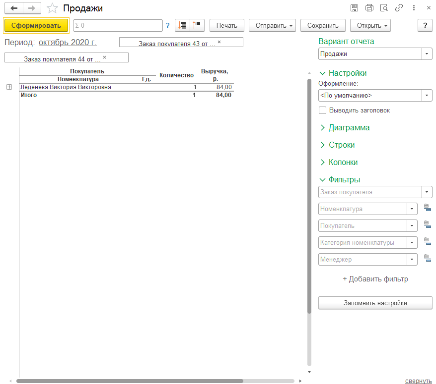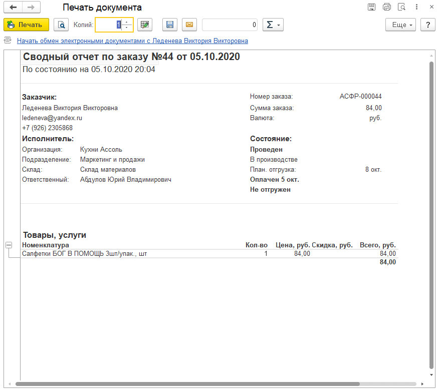 Виктория Лихушина, бухгалтер-консультант Линии консультаций «ГЭНДАЛЬФ» Регистрируем заказ клиента и формируем счет на оплату Главным документом управления продажами является «Заказ покупателя» (раздел «Продажи» – «Заказ покупателя»). Использование данного документа позволяет: Анализировать интересы клиентов и формировать воронки продаж. Контролировать сроки выполнения заявки клиента и планировать отгрузки. Анализировать количество и причины отказов клиентов. Для того чтобы в программу ввести заявку от клиента на приобретение товаров или услуг и затем выставить счет, создаем документ «Заказ покупателя» (раздел «Продажи» – «Заказ покупателя»). Рис.1 Заполняем верхнюю часть заказа и указываем заказанные клиентом товары и услуги. Если в «1С:УНФ» для номенклатуры установлены цены, то они автоматически появятся в заказе. Также цену можно ввести вручную и в дальнейшем скорректировать. После того как вся необходимая информация по заказу внесена, нажимаем кнопку «Провести и закрыть», которая находится в верхней части документа. Для отправки клиенту счета на оплату сразу с печатью и подписью (факсимиле) сформируем его из заказа покупателя по кнопке «Печатать», сохраняем его на компьютере в необходимом формате, а затем отправляем по электронной почте. Анализируем статусы заказов Чтобы получить полный список заказов на определенном этапе, откроем журнал заказов покупателей и в его правой части установим отбор по полю «Состояние». Если нам необходимо отследить статусы заказов конкретного заказчика или менеджера, то укажем контрагента в поле «Покупатель», а менеджера – в поле «Ответственный». Рис.2 Получаем и контролируем предоплаты по заказу Безналичная оплата от покупателя отражается с помощью документа «Поступление на счет». Его можно ввести на основании заказа покупателя, а также на основании выписки из банка (ее можно загрузить). Если покупатель оплачивает заказ наличными, то для отражения в системе предоплаты создаем документ «Поступление в кассу» на основании заказа покупателя. После этого переведем заказ покупателя в статус «В работе». Рис.3 Если по условиям договора отгрузка товара возможна только после предоплаты, то проверить ее наличие можно несколькими способами: Способ 1. Откроем сводный отчет в самом заказе покупателя, из него можно узнать о наличии или отсутствии предоплаты. Рис.4 Способ 2 В разделе «Продажи» перейдем по ссылке «Отчеты» и откроем отчет «Отгрузка и оплата по заказам». Рис.5 Отчет «Отгрузка и оплата по заказам» полезен тем, что показывает информацию одновременно об оплате и об отгрузке. С помощью этого отчета можно посмотреть все заказы покупателей, по которым отгрузки товаров еще не было, но предоплата уже поступила. Способ 3. Степень оплаты и отгрузки можно посмотреть по пиктограммам в первых двух колонках журнала заказов покупателей (Раздел «Продажи» - «Заказы покупателей»). Отгружаем товары Чтобы отразить факт отгрузки товаров по заказу, создаем документ «Расходная накладная» на основании «Заказ покупателя». Он автоматически заполнится товарами и данными покупателя из заказа. Рис.6 Затем нажимаем кнопку «Провести и закрыть». При проведении документа «1С:УНФ» списывает указанный в нем товар со склада, изменяет взаиморасчеты с клиентом и фиксирует выручку от продажи. В зависимости о