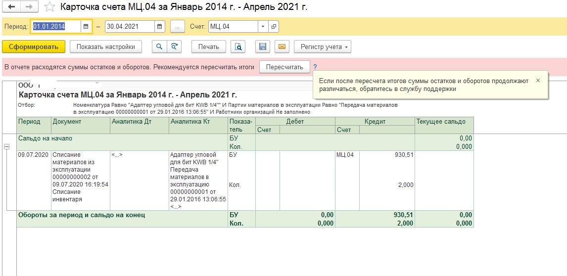Минусы есть. Откуда и почему - не понятно. Плюсов не вижу. В минус провалилась, сделала оборотку с 2014г. Там минуса нет. Есть списание. Программа пишет о несовпадении итогов. Выбираю перерасчёт. Но ничего не меняется.