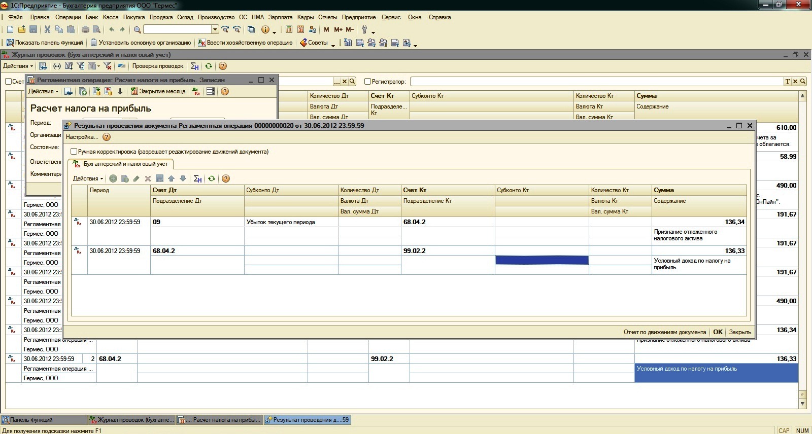 В прикрепленном файле фото. Не могу понять может ли быть разными при закрытии месяца: Признание отложенного налогового актива и условный доход по налогу на прибыль. Наверное где-то ошибка на 0,01 руб. Помогите где искать эту копейку!
