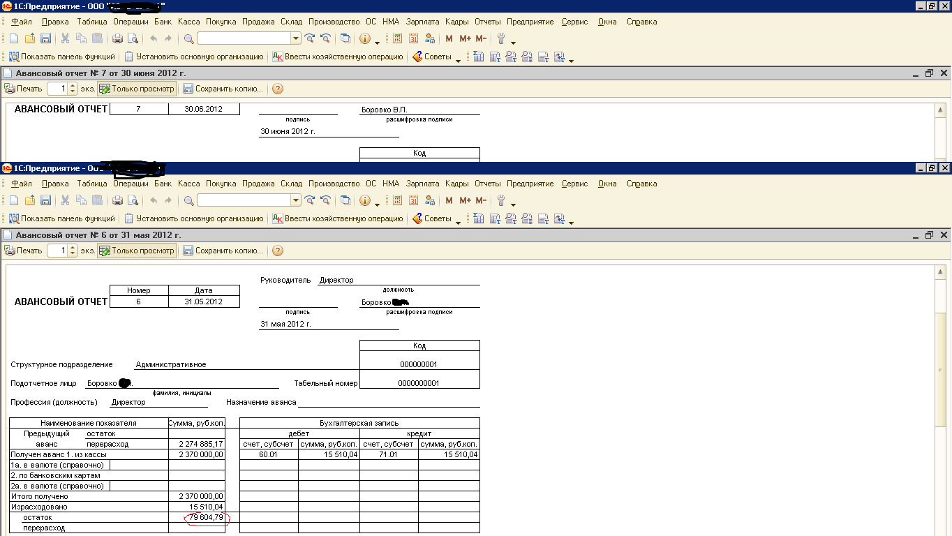 Не правильно заполняется печатная форма авансового отчета. На первом фото( за май ) остаток 79604,79