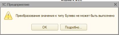 Хотел распечатать форму 4-ФСС и получил вот такое окно ошибки. Расшифровка следующая: {Отчет.РегламентированныйОтчет4ФСС.Форма.ФормаОтче та2012Кв1.Форма(2123)}: Преобразование значения к типу Булево не может быть выполнено Если мПроверятьСоотношенияПриПечатиИВыгрузки Тогда |