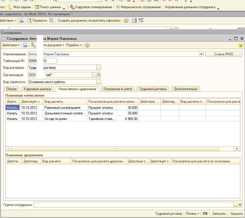 В 1С 8.2 ЗУП при расчете заработной платы начисляется Районный коэфф - дважды. При том что в Организации - занесен он единожды. Подскажите, с чем может быть связано ?