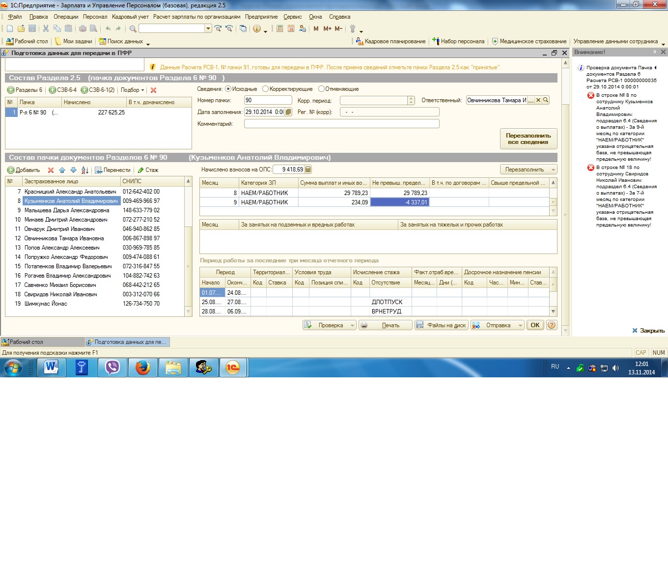 В сентябре месяце по сотруднику присутствует отрицательная облагаемая база в персонофицированном расчете. Ситуация такая ; сотрудник с 25.08.14 по 21.09.14 находится в отпуске, и в отпуске он заболел с 28.08.14 по 06.09.14 принес б/лист, и пришлось производить перенос отпуска. Я отнимаю отрицательную сумму в предыдущем месяце, а в текущем ставлю ноль. Но программа "ругается", такое исправление нужно делать и в других разделах формы РСВ-1. Подскажите, пожалуйста: как правильно мне все исправить??? |