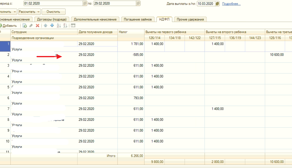 вычет 10600 прога ставит видимо именно поэтому остается только 10600, вот его она и вычитает правильно, за два месяца работы у сотрудника должно быть удержано и перечислено НОЛЬ налога Но!!! Сейчас за январь я должна удержать и уплатить 585р В итоге выйдет переплата