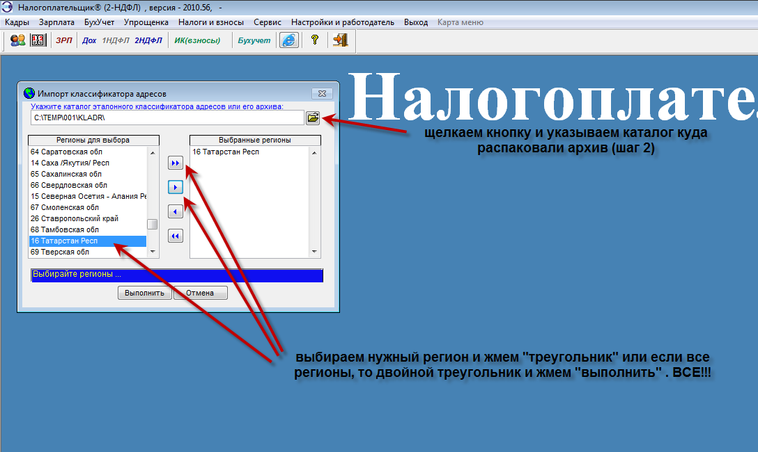 1. скачиваем по вышеприведенной ссылке 2. распаковываем в папку (см.вложение 1) 3. запускаем налогоплательщик и выбираем "настройки..." - "классификатор..." - "импорт" (см.вложение 2) 4. указываем папочку где распаковали архив (см. вложение 3) 5. ждем пока кладр будет импортирован. закрываем окошко импорта. наслаждаемся результатом (см.вложение 4)