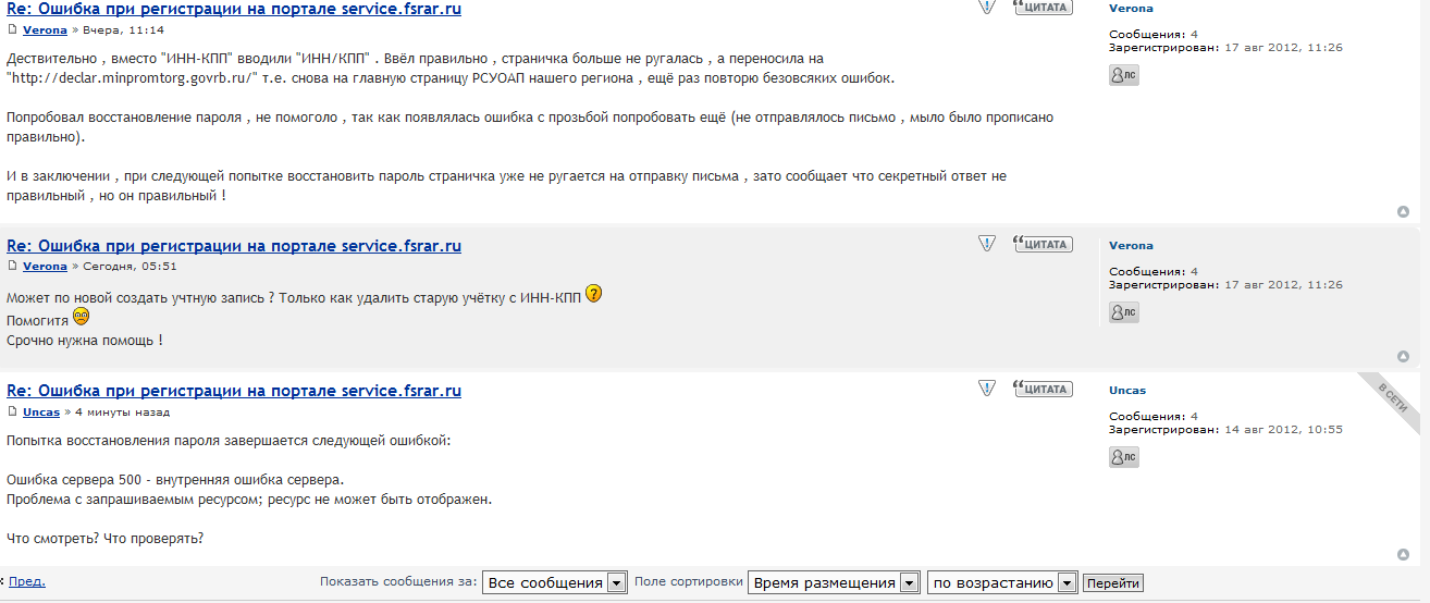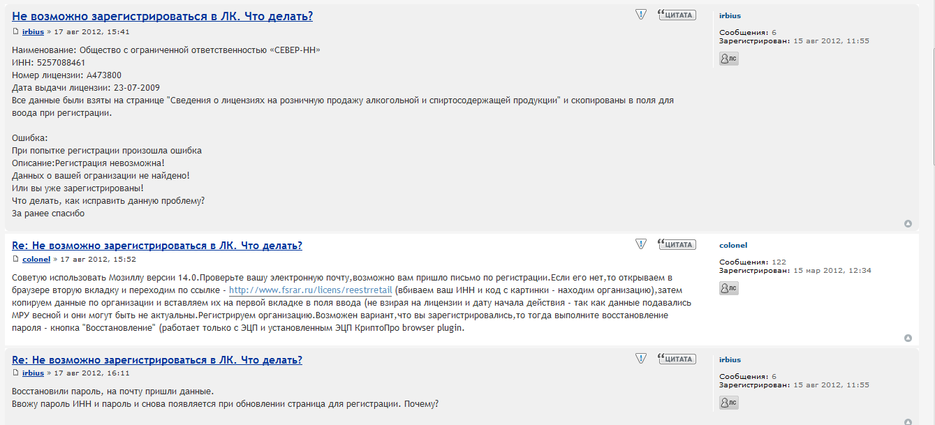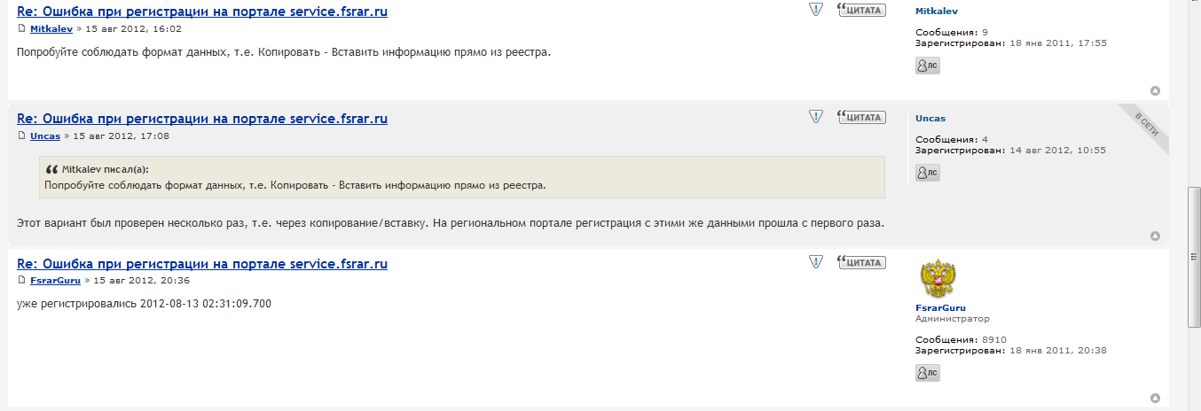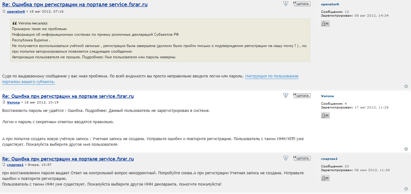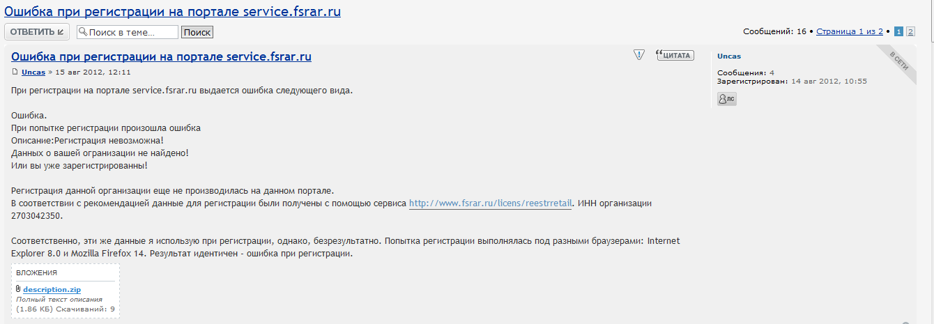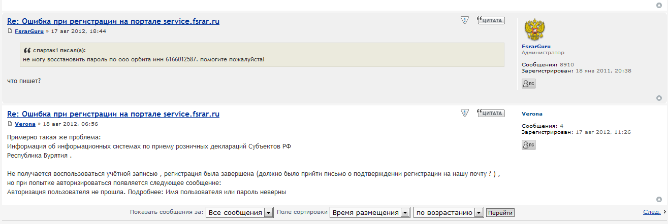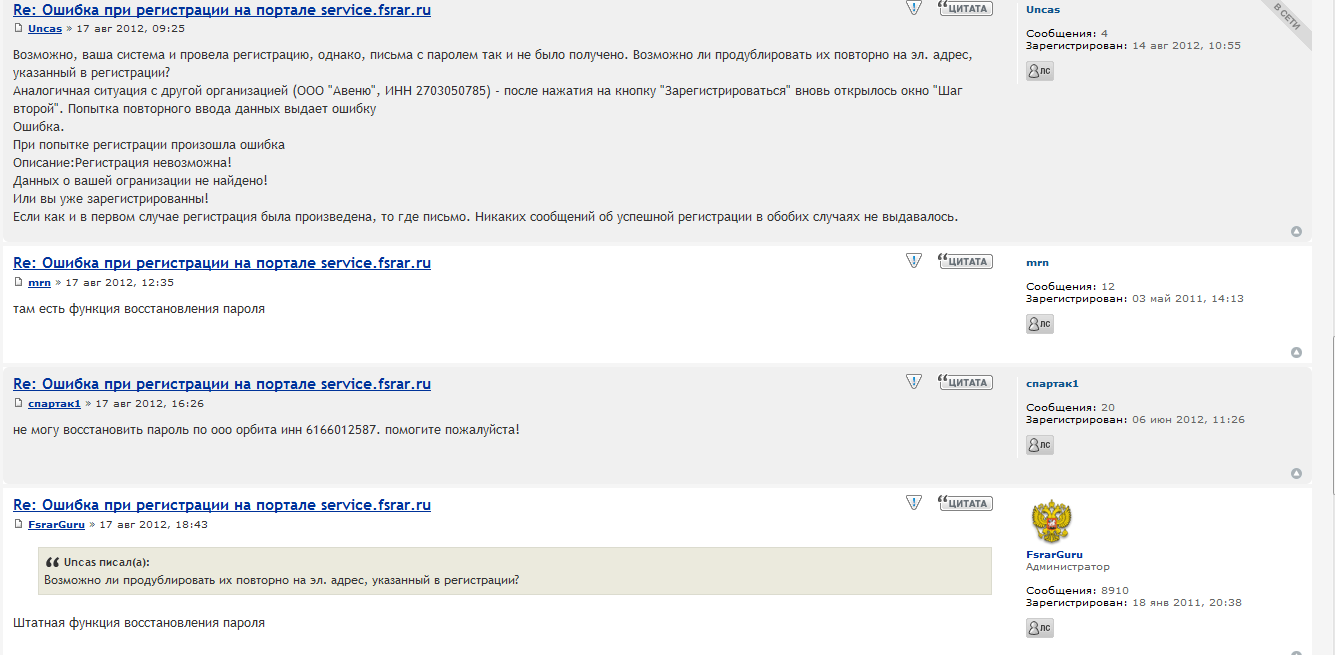 Спасибо за попытку помочь, но у меня оказалась другая проблема, сегодня смогла дозвониться к ФСРАР, и мы с администратором по пунктам разобрали проблему (кстати, очень вежливые там сотрудники), и оказалось что наш местный орган просто не подал сведения в РАР о нашей организации, теперь буду разбираться с нашей администрацией)))