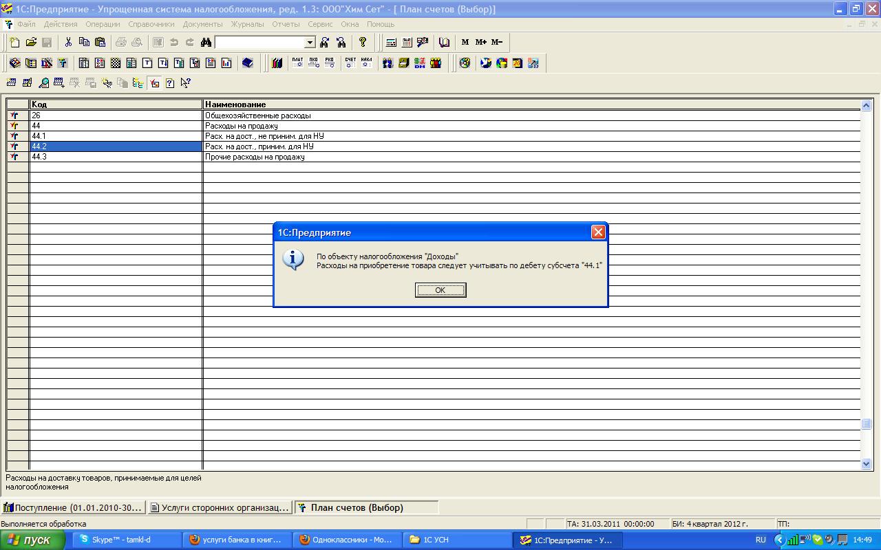 Вроде эта дата перехода на упрощенную систему налогооблажения. Но я сейчас попробовала её поменять и заново перепровести документы. Услуги сторонних организаций до 25.11.2010 проводятся проводкой дебет 44.2 кредит 60.2 а после 25.11.2010 проводятся дебет 44.3 кредит 60.1 почему?