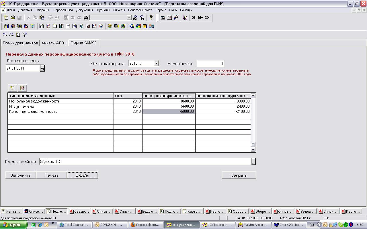 ***30: Ошибка в блоке <ЗадолженностьНаКонец>. Значение элемента <Накопительные> = -2100.00 блока <СтраховыеВзносы> в 2-й детальной строке за 2010-й год, равный 2010-го года расчетного периода (указанного в основном документе), должно быть неотрицательным