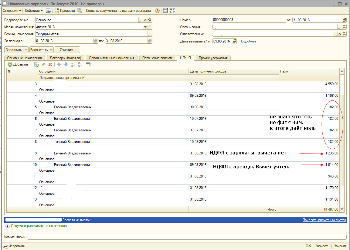 А поскольку по аналогичной схеме она применяла этот вычет и к аренде за июль в августе, то к зарплате за август она его уже не применяет. Как-то это всё надо поправить... Как же так извернуться, чтобы программа вообще не применяла вычет к аренде?
