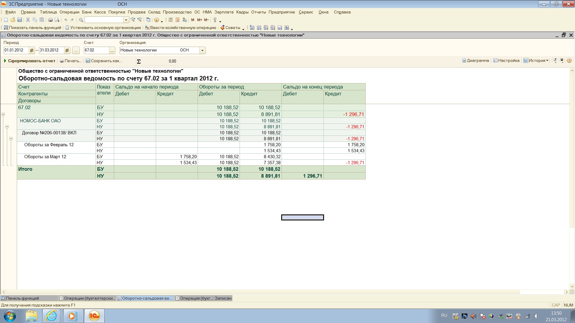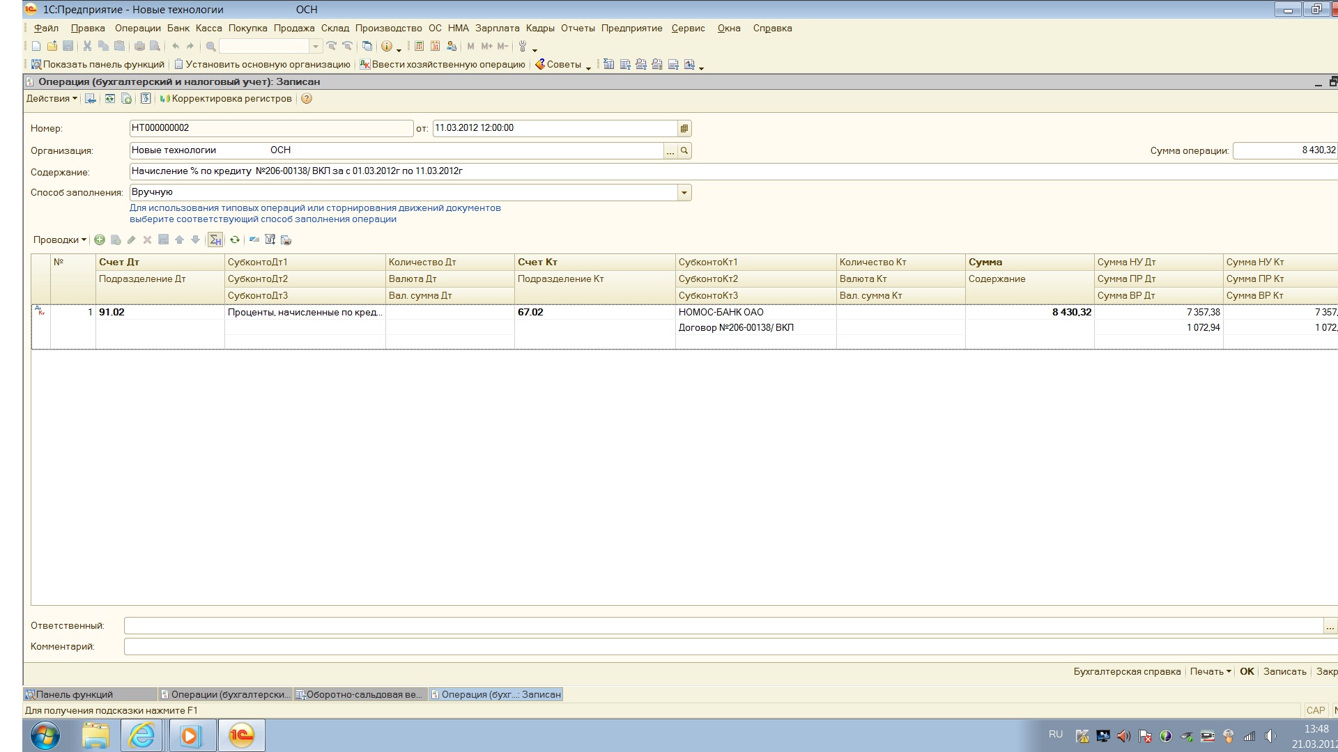 Помогите пожалуйста! Мы на ОСНО, взяли кредит. Как мне в 1С 8.2 отразить начисление процентов. Я делаю операцию вручную. 1) для БУ 1700000,00*16,5%*11дней/366дн=8430,32 Д91.02 К67.02, 2) для НУ 1700000,00*14,4%*11/366=7357,38. Получается 1072,94 к НУ не принимаются. Ставлю все эти суммы в операции вручную, и в ОСВ по 67 счету в целях НУ именно эта разница в минусе (перечисляем банку мы ведь 8430,32 и по БУ и по НУ-так?), это так должно быть или я что то не учла? Сделала принскрин для понятности.