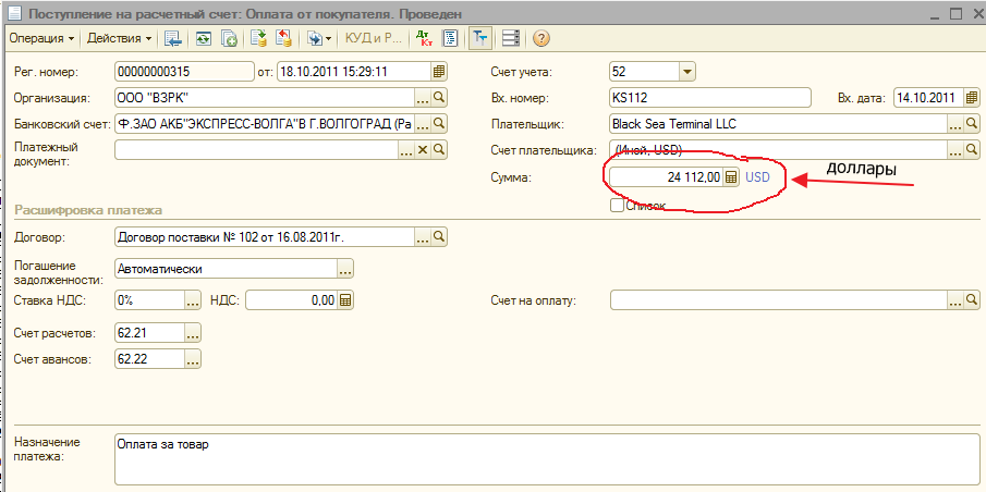 1. Поступление от иностранного покупателя валюты на расчетный счет валютный |