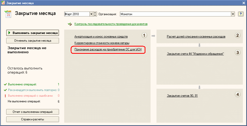 перебила, но при закрытии месяца июль пишет "нарушена последовательность регламентных операций. Ожидается изменение результатов выполнение операции "признание расходов на приобретение ОС для УСН" за июль 2013. Не понимаю, что нужно сделать