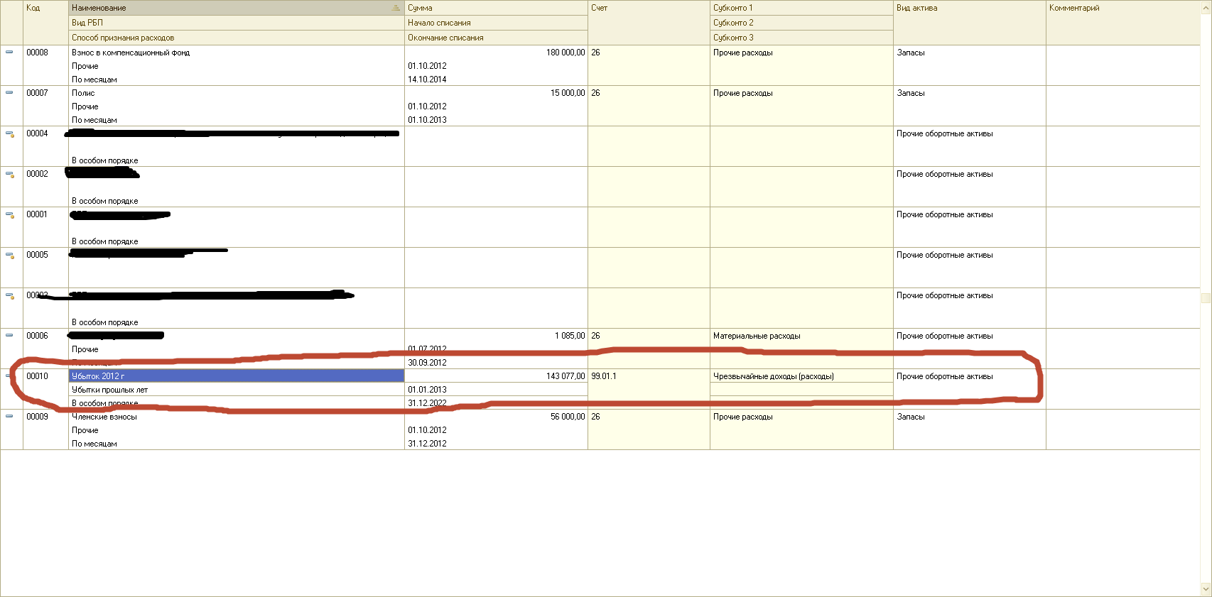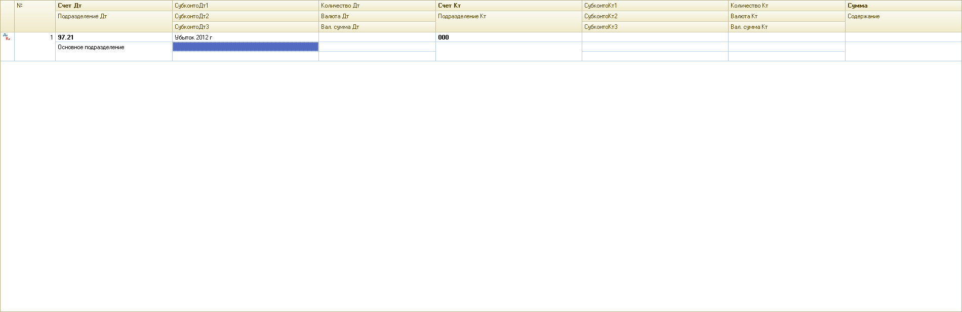 Стала делать проводки, чтобы не руками вносить в декларацию, а автоматически заполнилась. Сделала в том же порядке, как ты мне делала, но в декларации не заполняется год в табличке, что я не так делаю ? Описываю порядок по скринам: 1. Создала РБП 2. Сделала ручную операцию с проводкой в бух учете Дт 97.21 Кт 000 без суммы. Правильно ? 3. Проводка по НУ такая же, только там сумма убытка показана. 4. В оборотно-сальдовой ведомости сумма отражена по Дт 97.21 по НУ, по БУ этой суммы нет. 5. Заполнила декларацию прил.4 к листу 2, сумма встала автоматически, только не пойму почему она у меня не встала в колонку где года прописываются ?