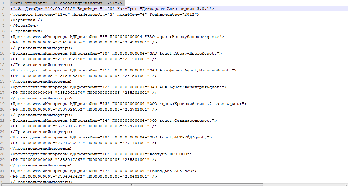 В строке №7 The required attribute 'П000000000005' is missing. В строке №7 The element cannot contain white space. Content model is empty. В строке №8 The element 'ПроизводителиИмпортеры' cannot contain child element 'РФ' because the parent element's content model is empty. В строке №10 The required attribute 'П000000000005' is missing. В строке №10 The element cannot contain white space. Content model is empty. В строке №11 The element 'ПроизводителиИмпортеры' cannot contain child element 'РФ' because the parent element's content model is empty. В строке №13 The required attribute 'П000000000005' is missing. В строке №13 The element cannot contain white space. Content model is empty. В строке №14 The element 'ПроизводителиИмпортеры' cannot contain child element 'РФ' because the parent element's content model is empty. В строке №16 The required attribute 'П000000000005' is missing. не могу понять где у меня косяк по декларации. подскажите?! мой XML <?xml version="1.0" encoding="windows-1251"?> <Файл ДатаДок="19.09.2012" ВерсФорм="4.20" НаимПрог="Декларант Алко версия 3.0.1"> <ФормаОтч НомФорм="11-о" ПризПериодОтч="3" ПризФОтч="4" ГодПериодОтч="2012"> <Первичная /> </ФормаОтч> <Справочники> <ПроизводителиИмпортеры ИДПроизвИмп="8" П000000000004="ЗАО "Новокубанское""> <РФ П000000000005="2343000056" П000000000006="234301001" /> </ПроизводителиИмпортеры> <ПроизводителиИмпортеры ИДПроизвИмп="10" П000000000004="ЗАО "Абрау-Дюрсо""> <РФ П000000000005="2315092440" П000000000006="231501001" /> </ПроизводителиИмпортеры> <ПроизводителиИмпортеры ИДПроизвИмп="11" П000000000004="ЗАО Агрофирма "Мысхако""> <РФ П000000000005="2315005310" П000000000006="231501001" /> </ПроизводителиИмпортеры> <ПроизводителиИмпортеры ИДПроизвИмп="12" П000000000004="ОАО АПФ "Фанагория""> <РФ П000000000005="2352002170" П000000000006="235201001" /> </ПроизводителиИмпортеры> <ПроизводителиИмпортеры ИДПроизвИмп="13" П000000000004="ООО "Крымский винный завод""> <РФ П000000000005="2337026352" П000000000006="233701001" /> </ПроизводителиИмпортеры> <ПроизводителиИмпортеры ИДПроизвИмп="14" П000000000004="ООО "Стандартъ""> <РФ П000000000005="5247016299" П000000000006="524701001" /> </ПроизводителиИмпортеры> <ПроизводителиИмпортеры ИДПроизвИмп="18" П000000000004="ООО "ФОТРЕЙД""> <РФ П000000000005="7721666921" П000000000006="771401001" /> </ПроизводителиИмпортеры> <ПроизводителиИмпортеры ИДПроизвИмп="16" П000000000004="Фортуна ЛВЗ ООО"> <РФ П000000000005="2353017267" П000000000006="235301001" /> </ПроизводителиИмпортеры> <ПроизводителиИмпортеры ИДПроизвИмп="17" П000000000004="ГЕЛЕНДЖИК АПК ЗАО"> <РФ П000000000005="2304042422" П000000000006="230401001" /> </ПроизводителиИмпортеры> <Поставщики ИдПостав="7" П000000000007="ООО "Оптима""> <РФ> <Лицензии> <Лицензия ИдЛицензии="7" П000000000011="А,617607" П000000000012="05.04.2011" П000000000013="23.04.2012" П000000000014="Федеральная служба по регулированию алкогольного рынка" /> </Лицензии> <ЮЛ П000000000009="2311096193" П000000000010="231101001" /> </РФ> </Поставщики> <Поставщики ИдПостав="8" П000000000007="ЗАО "Новокубанское""> <РФ> <Лицензии> <Лицензия ИдЛицензии="9" П000000000011="Б,071622" П000000000012="10.11.2010" П000000000013="19.07.2016" П000000000014="Федеральная служба по регулированию алкогольного рынка" /> </Лицензии> <ЮЛ П000000000009="2343000056" П000000000010="234301001" /> </РФ> </Поставщики> <Поставщики ИдПостав="9" П000000000007="ООО "Логист""> <РФ> <Лицензии> <Лицензия ИдЛицензии="5" П000000000011="А,647774" П000000000012="30.06.2011" П000000000013="11.04.2016" П000000000014="Федеральная служба по регулированию алкогольного рынка" /> </Лицензии> <ЮЛ П000000000009="2302065858" П000000000010="230201001" /> </РФ> </Поставщики> </Справочники> |