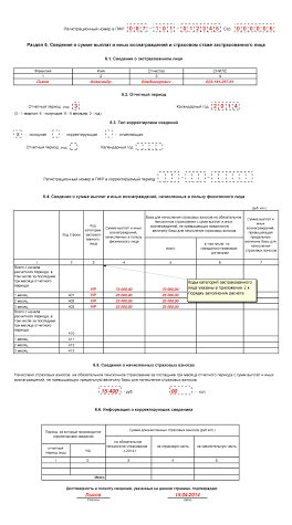 В поле «Количество застрахованных лиц, на которых представлены сведения о сумме выплат и иных вознаграждений и/или страховом стаже» указывается общее количество застрахованных лиц в соответствии с количеством представленных Разделов 6 «Сведения о сумме выплат и иных вознаграждений и страховом стаже застрахованного лица» за каждое застрахованное лицо за отчетный период. В поле «На страницах» указывается количество страниц представляемого Расчета, в том числе и страниц Раздела 6 (в Расчете применяется сквозная нумерация заполненных страниц).