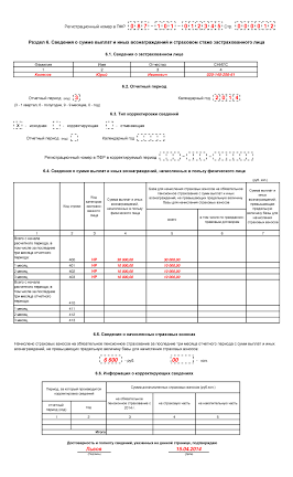 Раздел 6 формы РСВ-1 — документы «Сведения о сумме выплат и иных вознаграждений и страховом стаже застрахованного лица», которые представляются одним или несколькими файлами документов. Один файл документов «Сведения о сумме выплат и иных вознаграждений и страховом стаже застрахованного лица» представляет собой одну пачку документов и может содержать не более 200 документов.