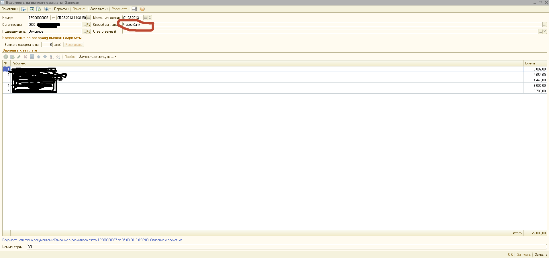 Elee, в ведомости способ выплаты какой? "через банк"?