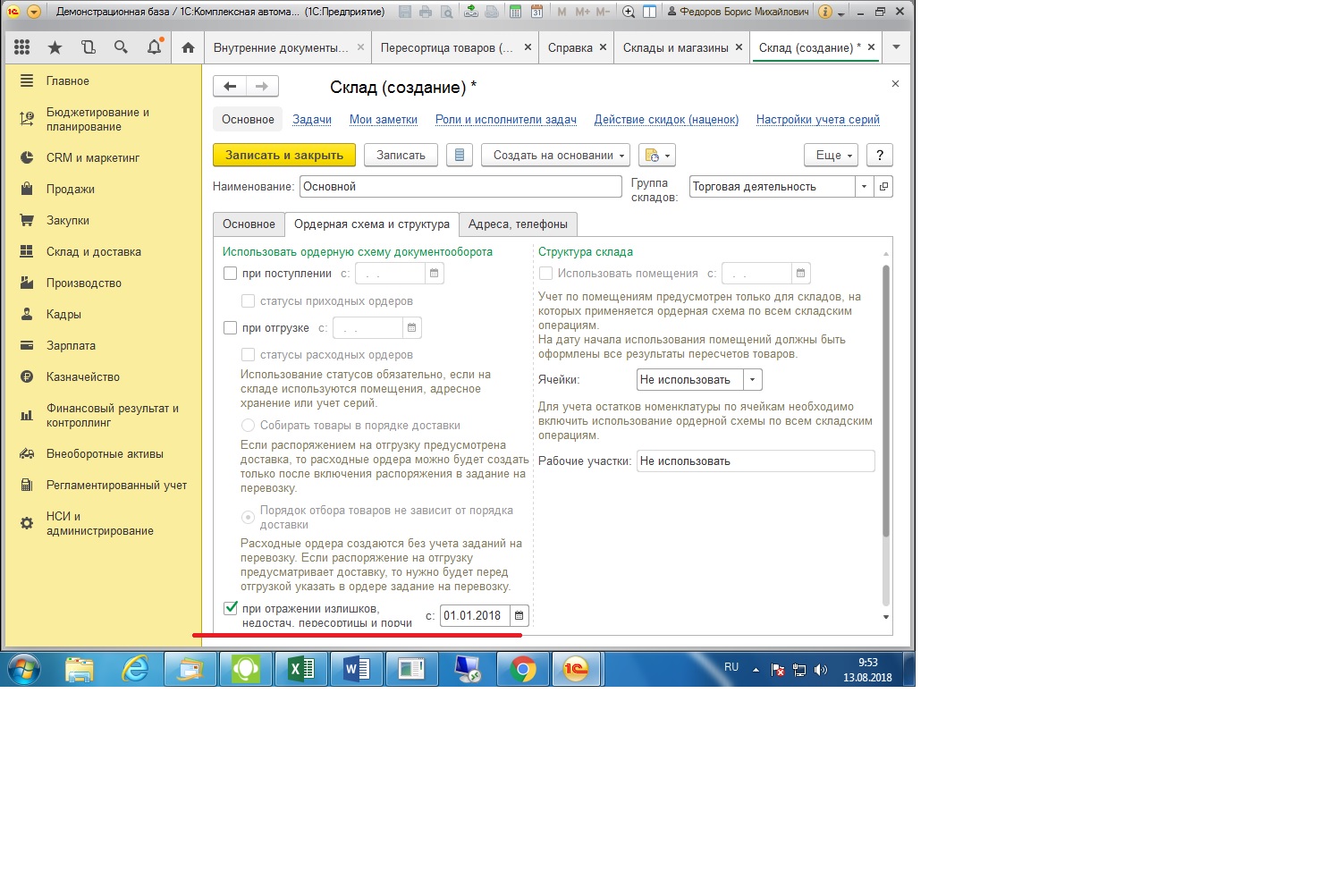 да ордерная схема не применяется, но сейчас зашла посмотрела - в настройках оптовых складов на вкладке ордерная схема стоит галка "при отражении излишек, недостач, пересортицы... с...", я эту галку не ставила, она стоит по умолчанию с момента создания склада, в розничном складе её нет. Я полагаю её нужно убрать и пересортица будет работать, как убрать не знаю