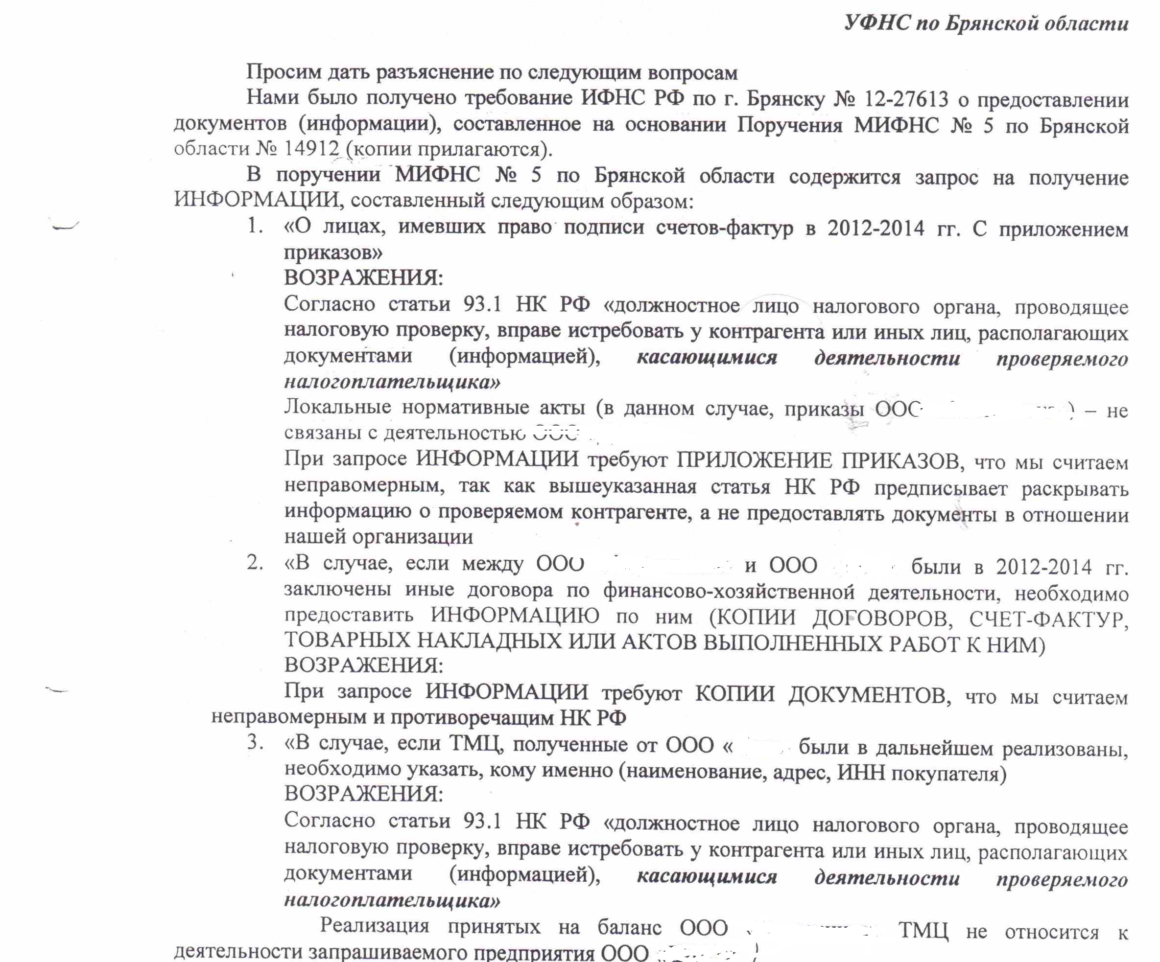 В связи с вышеизложенным полагаем, что за нашей организацией нет обязанности предоставлять перечисленные в Требовании документы по указанным основаниям. Кроме того, в виду отсутствия каких бы то не было сделок с проверяемой организацией, документы для предоставления отсутствуют.