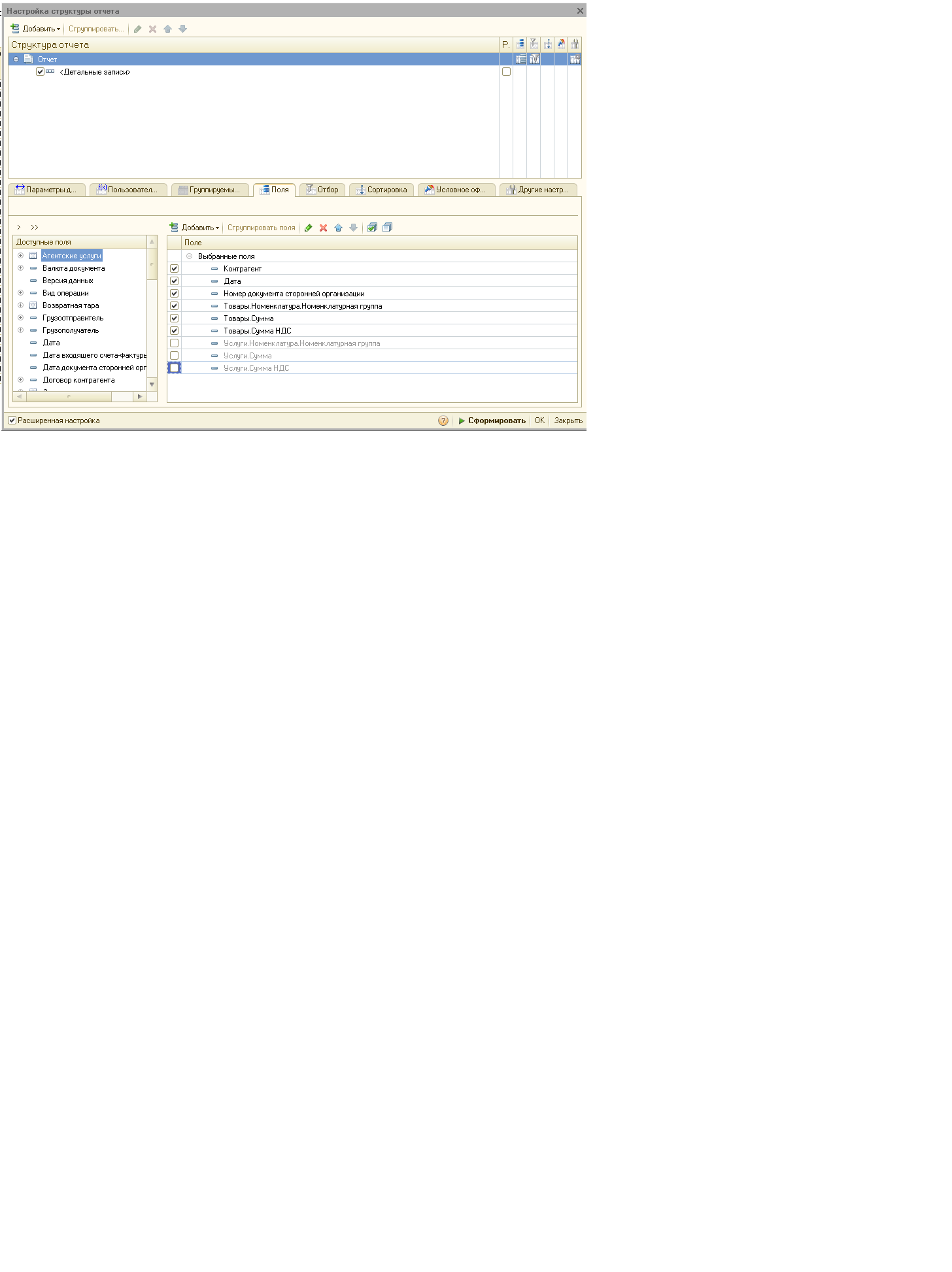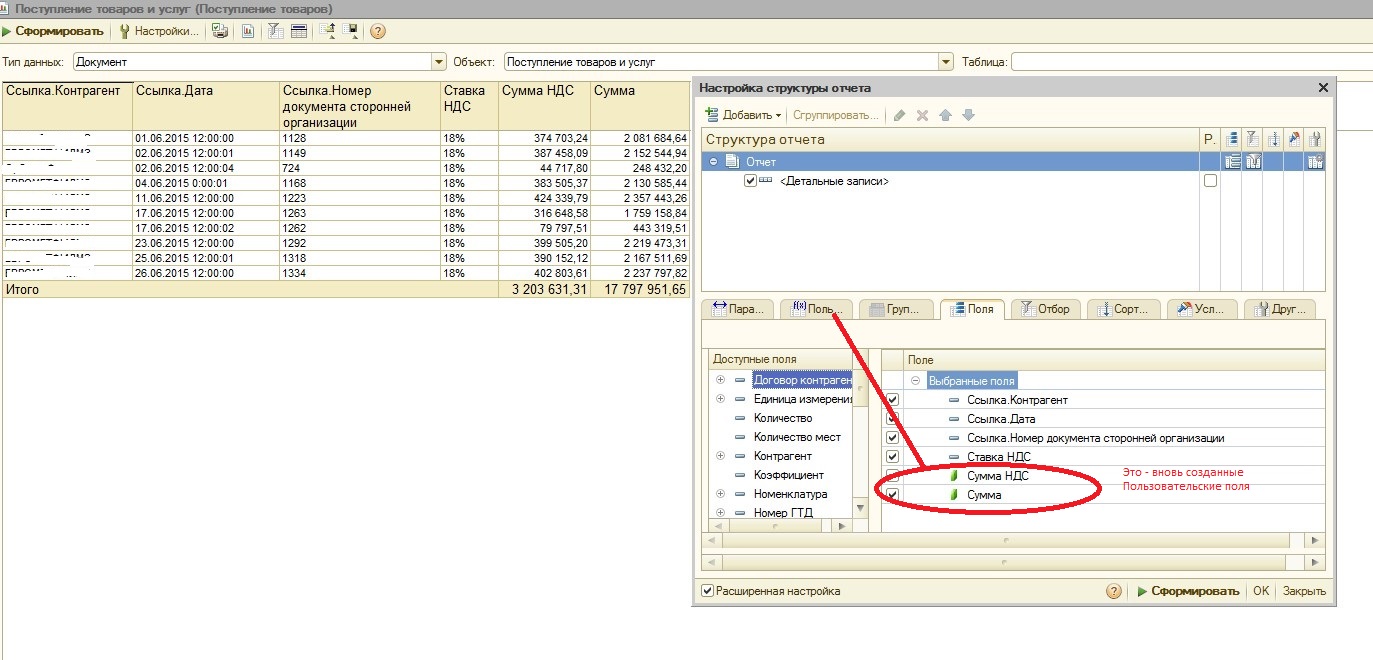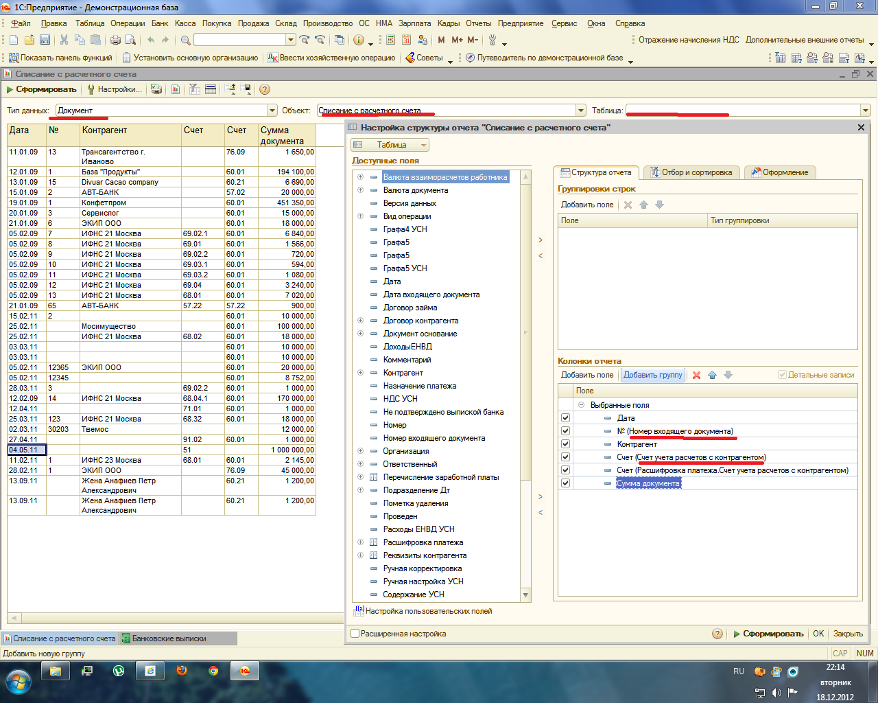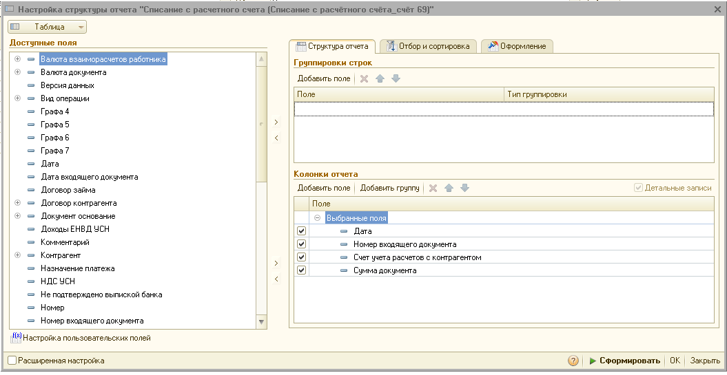 Поэтому устанавливать отбор по счету 60 вы можете только по таблице "расшифровка платежа" - строка отбора будет выглядеть так "Расшифровка платежа.Счет учета расчетов с контрагентом" - посмотрите как я настроила колонки. Только нам это ничего не даст, т.к. данные в этой таблице есть независимо от вида операции ... просто если выбрать операцию "перечисление налога" эта таблица не будет использоваться (и видна на экране тоже не будет). Именно поэтому в той колонке для всех документов указан счет 60 - он в ней присутствует всегда. Как-то так, извиняюсь за сумбур) |