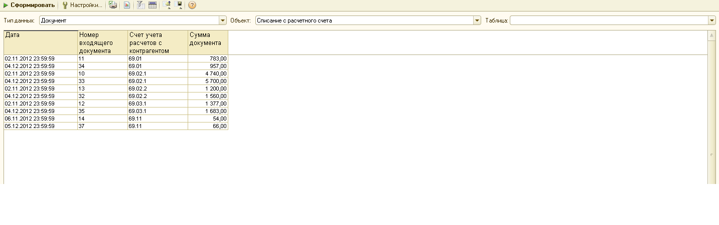 Мне сложно это грамотно объяснить, т.к. я не программист ... но попробую своими словами. В док. Списание с расчетного счета при выбранных операциях "оплата поставщику", "прочие расчеты с контрагентами" и т.п. данные хранятся в отдельной таблице (изнутри) - "Расшифровка платежа". А если идет уплата налогов или прочее списание, то счет расчетов можно взять из самого документа. По з/пл тоже отдельная таблица.