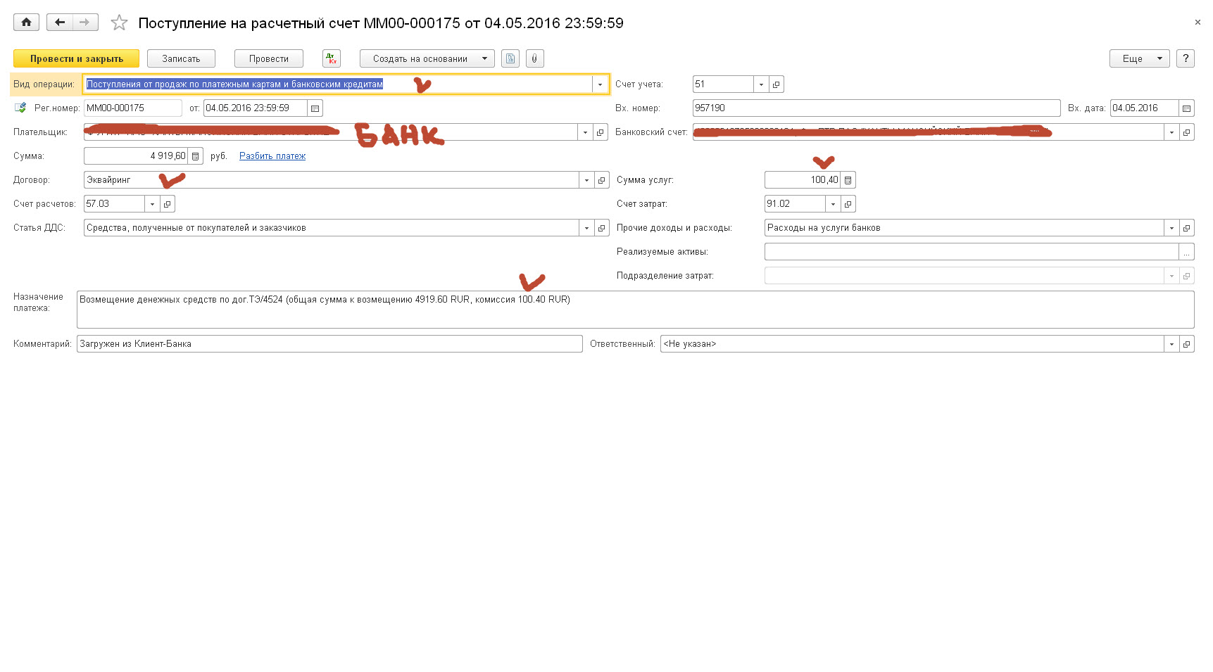 У меня по Выписке получается так: 51-57 пришло 180 руб 57-62 200 оплата покупателя 91-57 20 комиссия банка это я делаю операциями вручную, мука такая по несколькоприходов в день, а мне нужно учет 2015 года восстановить, вот думаю может можно одной операцией в месяц провести? кто-нибудь так делал? критично? но вот в чем у меня следующий вопрос, компания у меня УСН 6% и принимаю я к налогооблагаемому доходу, с которого будет удержан налог 6% - 200 ? несмотря на то что пришло только 180 и банк удержал свою комиссию |