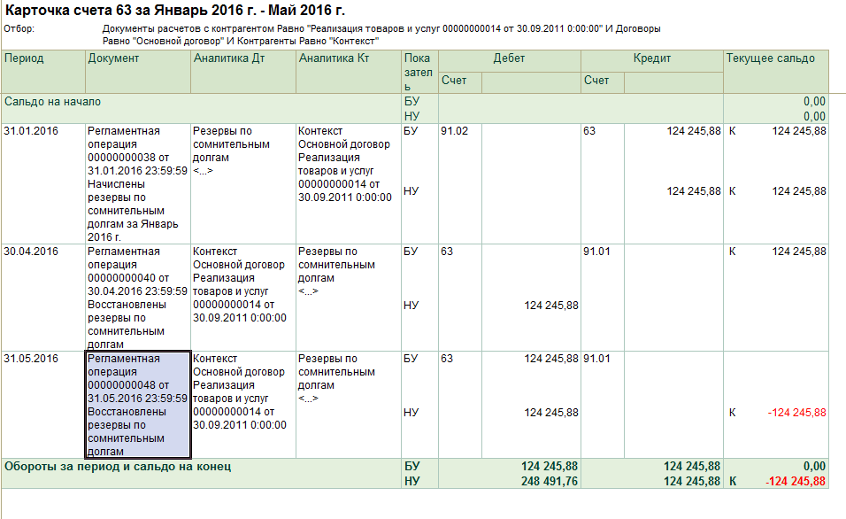 В настройках стоит галка, что создавать в БУ. В НУ - ни-ни. И вот посмотрите, что она мне наворочала... Вообще понять ничего не могу. В январе начислен резерв. С какого-то перепугу в НУ тоже... В апреле резерв по НУ восстановлен. Видать одумалась. Далее в мае я вообще эту сумму списываю, т.к. три года истекли. И вот тебе - в том же мае программа восстанавливает резерв. В БУ вроде так и правильно. А откуда НУ то берется второй раз?