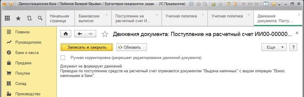 Операция "взнос наличными" не формирует проводок