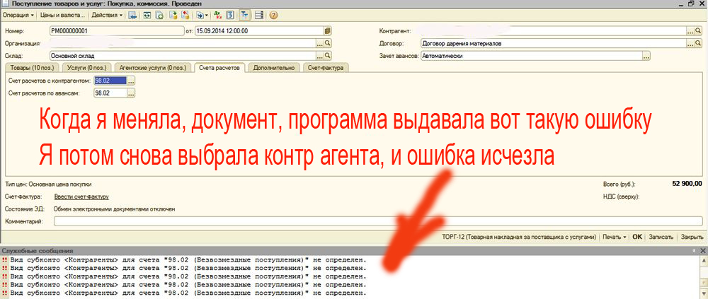 Я всё изменила, и провела закрытие месяца с сентября 2014 год. Но вот в оборотке теперь по счёту 98.02 висит - 52 900 , раньше у меня вылазила ошибка, при редакции документа "поступления, товара", фото прикладываю , я заново выбрала контрагента и ошибка меня перестала беспокоить.