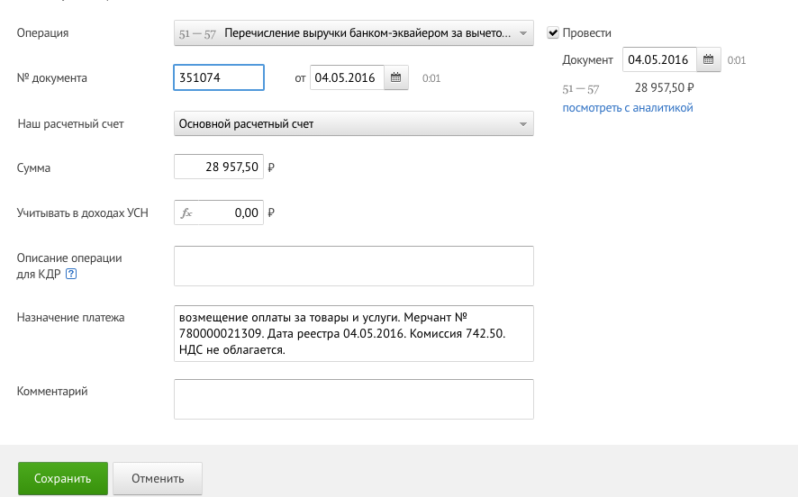 И сумма должна отображаться не в Дт 50, а на 57 счете. Вернее наличные будут в Дт 50, а по картам будет на 57. При выписке банка будет проводка Дт 51 Кт 57 без комиссии, и проводка Дт 51 Кт 91.02 комиссия банка.