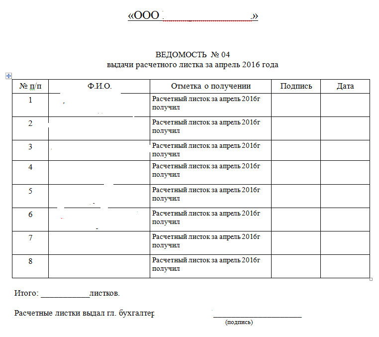 У меня есть Ведомость выдачи Расчетного листка. Там у меня и расписываются работники, что "Расчетный листок за ....20...г получил.