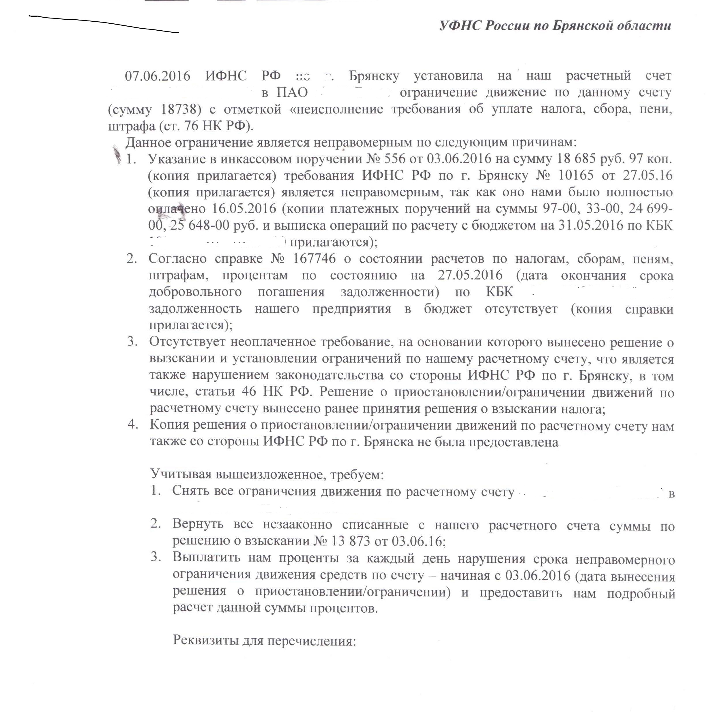 Просим пояснить, на каком основании вами была неправомерно сторнирована наша оплата 30 914 руб. 00 коп. (дата оплаты 15.01.2016). Копия выписки операций по расчету с бюджетом по состоянию на 31.05.2016 по КБК 1821010201001000110